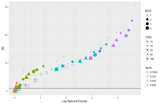 Figure 3. The basic reproduction number (R0) of simulated epidemics increases as the Entropy of a contact dataset (shown here as log spectral density) increases due to processing decisions. SpTh value is indicated by color (orange = 0.1665 m, green = 0.333 m, blue=0.666 m, purple = 0.999 m); TSW is indicated by shape (circle = 10 sec; triangle = 15 sec; square = 30 sec; cross = 60 sec; x-box = 180 sec); MCD value is indicated by size.