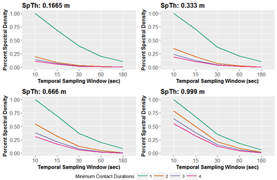 Most location data collected are ultimately point-based. That is, at each time point, tracked individuals’ locations are represented as a single geographic or planar coordinate pair (e.g., longitude/latitude, or x/y, respectively). Inter-point contact is generally determined by temporally aligning location data, then assessing spatial proximity of points at a particular spatial threshold of contact (SpTh) during a temporal sampling window (e.g., 10 seconds), for an assigned minimum duration necessary to ascribe a contact (MCD). In Dawson et al. (2019), we demonstrated that how point data is processed significantly influences the contact structure of the resulting dataset, and any inferences drawn from observed contacts. In particular, decisions about the SpTh, TSW, MCD, and the temporal aggregation of location datasets significantly influence derived contact data (Figure 1). One way to conceptualize this influence is by calculating the information content of contact datasets as Entropy, which measures the information loss that occurs as the criteria for counting something as a contact changes. We show that SpTh, TSW, and MCD interact to influence information content (i.e. entropy) of the contact structure of dataset by reducing information as criteria become more stringent (Figure 2). Furthermore, we show that these effects translate to epidemiological effects when contact data are used in infectious disease transmission models (Figure 3).