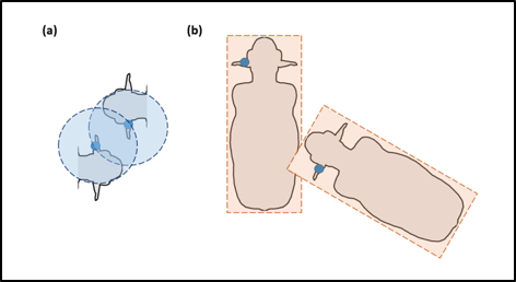 Figure 4. Point-based vs. polygon-based contact definitions. (a) Contacts occur when points are observed within a predefined radial distance of one another. (b) Contacts occur when polygons intersect.