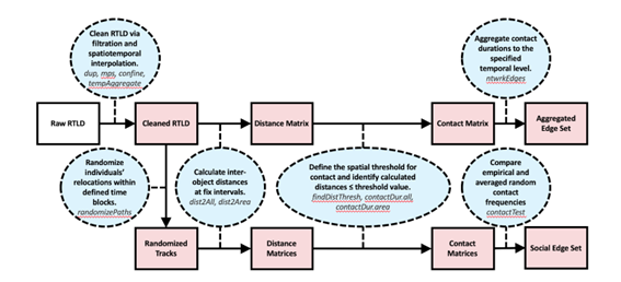 Our package, contact, contains 20+ functions in a processing pipeline to help researchers use RTLS data for contact and social network analyses (Figure 5). To use this package, users need only have a dataset containing point (i.e., latitude/longitude, or planar xy coordinates) or polygon (i.e., polygon shapefile) spatial data, individual IDs relating spatial data to specific individuals, and date/time information relating spatial data to temporal locations. Through package functions, users can create contact networks based on proximity- or intersection-based contact definitions, and can easily implement the novel methodologies described in Farthing et al. (2019). Furthermore, contact functions are not limited to describing inter-animal contacts, as users can also can quantify and characterize “contacts” between individuals and fixed areas (e.g., home ranges, waterbodies, buildings, etc.). As such, this package is an incredibly useful resource for facilitating epidemiological, ecological, ethological and sociological research.